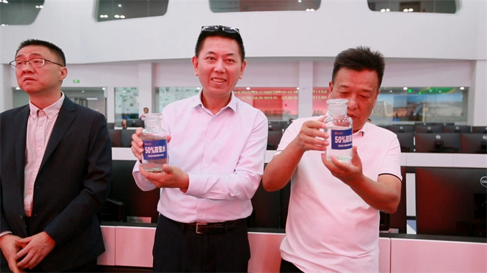在8月16日的投產(chǎn)活動中,操作人員依照規(guī)程,現(xiàn)場采取兩瓶晶瑩剔透的雙氧水液體樣品,送至中央控制室,由李董事長與索爾維黃總共同檢驗產(chǎn)品,共同見證雙方精誠合作的結(jié)晶。