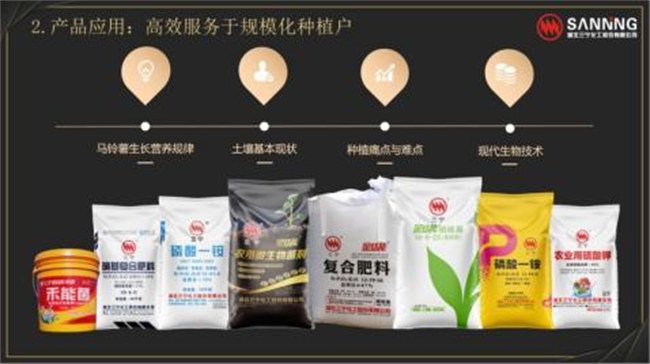 在產(chǎn)品研發(fā)領(lǐng)域,三寧化工深耕馬鈴薯主產(chǎn)區(qū),根據(jù)當(dāng)?shù)貧夂?、土壤、種植管理等特點(diǎn),結(jié)合現(xiàn)代生物技術(shù),推出了精準(zhǔn)適用于西北地區(qū)的金鈦能馬鈴薯12-19-16(含鋅、錳)專用肥及水肥一體化營(yíng)養(yǎng)套餐等產(chǎn)品為馬鈴薯生長(zhǎng)提供有力保障。